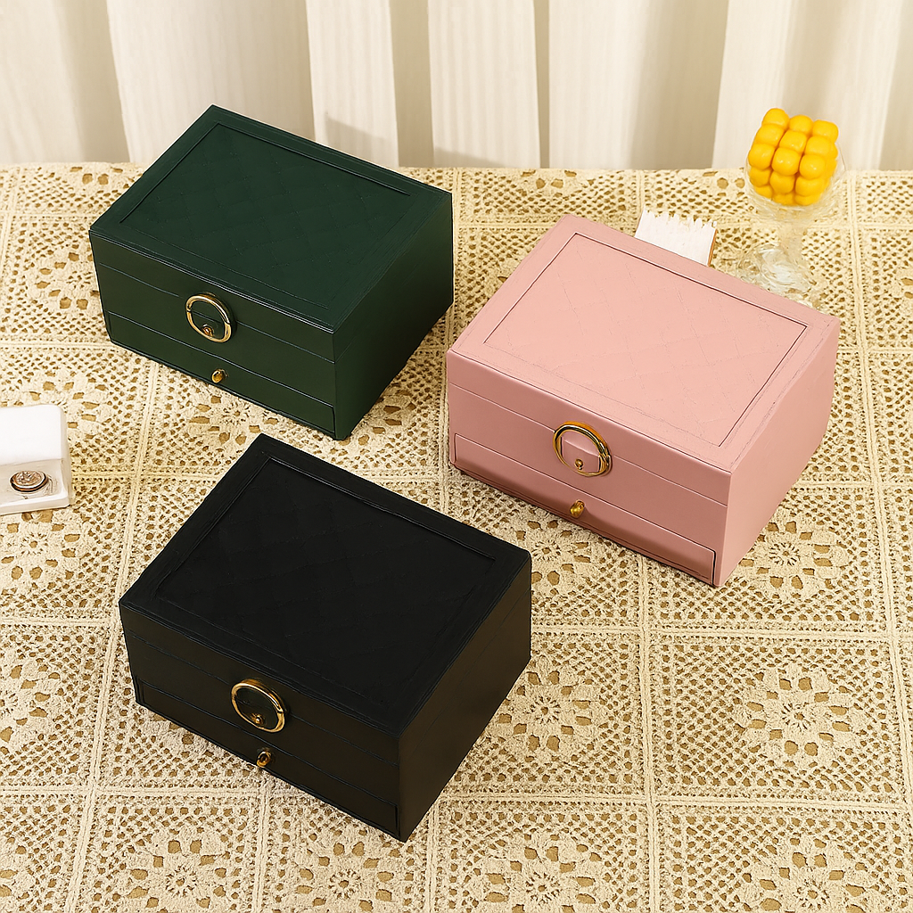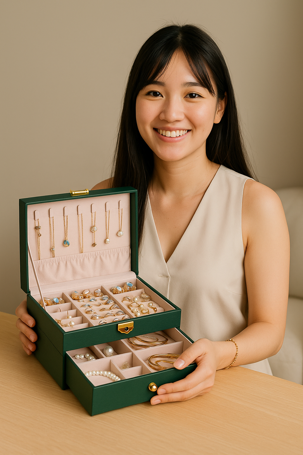 La boîte dispose de plusieurs compartiments pour bagues, boucles d’oreilles, colliers et bracelets. Deux tiroirs permettent de ranger des accessoires plus volumineux comme des montres ou chaînes épaisses.